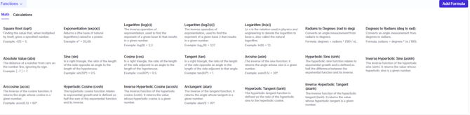 Also keep in mind you can incorporate ready-made mathematical functions and operations listed below the editor to create your formulas. You can display them by clicking the FUNCTIONS button.